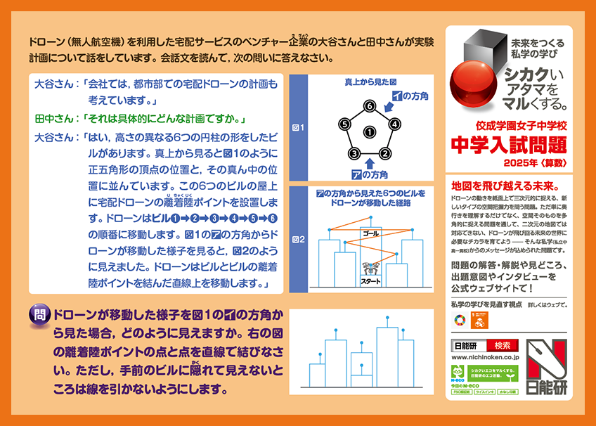 立体図形の問題では体積や表面積を求める問題が多い中、空間把握そのものに焦点を当てた問題です。また、ドローン技術の商業化という、現在・近い将来の話題を取り上げ、交通が3次元化する未来を見据えた問題です。交通が2次元だったときは紙・画面の上で考えられるような事柄も、3次元になることで、紙面上で考えるのは難しくなります。未来の交通網も想像させる問題となります。