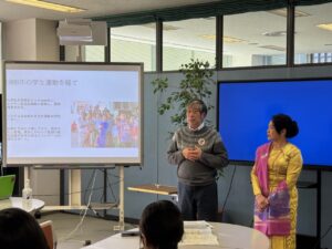SGコースでは、クーデター発生以降、ミャンマーの民主化について考える特別授業を毎年開催しています。在日ビルマ人のウィンチョさん・マティダさんご夫妻をお招きし、いつも親身に現地の状況を教えて頂いています。