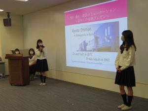 1. 高1生2名の元気な司会進行によりスタート。高2生2名が、個別研究までの歩みをプレゼンしました。英語や国際文化の授業で進めている探究学習や高大連携学習について、自分たちの取り組みを振り返りながらいきいきと紹介しました。