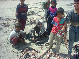 これは、高橋教授が2003年のイラク戦争終結直後に現地で撮影した写真です。戦争によって破壊されるのは、電気・上下水道・道路などのインフラだけではありません。社会システム、特に治安の崩壊が大きな問題です。この写真に写っているのは、戦争直後に無政府状態となった街で、子どもたちが生活のために電線を盗んでいる光景だそうです。子どもたちの屈託ない姿と、紛争地帯の厳しい現実。そのギャップを捉えた象徴的な写真です。